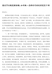 国庆节专题党课讲稿:学党史、学国史,听党话、跟党走,爱党爱国在近一个世纪的奋斗与探索中,中国共产党成为引领中国革命、建设和发展的一面光辉旗帜,带领人民把一个积贫积弱的旧中国,建设成为繁荣富强的新中国。学党史、学国史,听党话、跟党走,爱党爱国,立德立行是当代青少年的重要一课,党的光辉旗帜将指引广大青少年健康成长、发愤图强。在喜迎新中国成立xx周年的日子里,作为一名有40多年党龄的xx工作者,能和大家一起回顾党的光辉历程,讲述国家的日新月异,我感到无比高兴。在近一个世纪的奋斗与探索中,中国共产党成为引领中国革命、建设和发展的一面光辉旗帜,带领人民把一个积贫积弱的旧中国,建设成为繁荣富强的新中国。x...