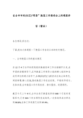 在全市市村(社区)“两委”换届工作推进会上的通报讲话(精品)各位领导,同志们:下面,我向大家通报一下换届工作启动以来的有关情况。一、全市换届工作的基本情况自12月4日全市村级党组织换届选举工作全面铺开以来,在市委的坚强领导下,在市换届工作领导小组的精心组织和各成员单位的通力协作下,各镇(街)党(工)委坚决扛起主体责任,周密部署,精心实施,推动换届工作依法依规、平稳有序进行。总体来看,全市换届工作开局良好、势头强劲、进展顺利。截至今天上午9时,全市应进行换届选举的580个行政村党组织中,已有565个村庄顺利完成选举,一次性选举成功率达到98.8%,总体工作进度已达到97.4%。从各镇(街)的进度来看,呈现出“整体推进快、区域不均衡”的特点。目前,已有超过三分之二的镇(街)实现了100%完成换届...