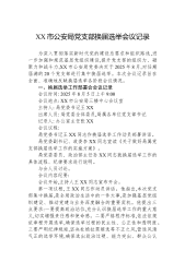 XX市公安局党支部换届选举会议记录为深入贯彻落实新时代党的建设总要求和组织路线,进一步加强和规范基层党组织建设,提升党支部的组织力、凝聚力和战斗力,XX市公安局党委决定于2025年8月,对任期届满的20个党支部进行集中换届选举。本次会议记录旨在全面、准确地反映换届选举各阶段会议情况。一、换届选举工作部署会会议记录会议时间: 2025年8月5日上午9:00会议地点: XX市公安局三楼中心会议室主持人: 局党委书记王XX出席人员: 局党委全体委员,局属各单位党支部书记记录人: 办公室主任张XX会议议程: 局党委书记王XX同志作换届选举工作动员部署讲话。局党委副书记、政委李XX同志宣读《关于做好局属党支部换届选举工作的实施方案》。局党委委员、政治部主任孙XX同志就换届选举工作的具体流程、纪律要求...