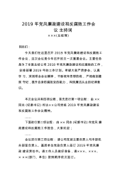 2019年党风廉政建设和反腐败工作会议主持词×××(总经理)同志们:今天我们在这里召开2019年党风廉政建设和反腐败工作会议,这次会议是今年召开的又一次重要会议。主要任务是为了全面总结公司2018年党风廉政建设和反腐败的工作,安排部署2019年的工作计划。希望大家严肃参会、认真学习、深刻领会会议精神,不断筑牢思想防线,严格做到遵规守纪,提升自身防腐拒变的能力,构筑廉洁从业的纪律意识。本次会议共有四项议程,首先进行第一项议程:由××同志(纪委书记)传达××公司党组2019年党风廉政建设和反腐败工作会议精神。……下面进行第二项议程:由××同志(纪委书记)作党风廉政建设和反腐败工作报告,大家欢迎;…...