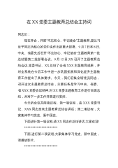 在XX党委主题教育总结会主持词同志们:现在开会,开展“不忘初心、牢记使命”主题教育,是以习近平同志为核心的党中央作出的重大部署。9月7日和8日,中央、省委先后召开“不忘初心、牢记使命”主题教育第一批总结暨第二批部署会议。9月12日,XX召开了主题教育总结会议,党委书记、XX总结了全省XXX主题教育成果,并对全系统在今后工作中进一步巩固拓展和深化提升主题教育工作提出了具体要求。今天,我们召集全辖党员同志,召开这次主题教育总结会,主要任务是学习中央、省委、省XXX党委会议精神,对XX党委主题教育工作进行全面总结,并对下一步工作开展进行安排。今天的会议共两项议程。第一项议程,由XXX党委书记、XXX...