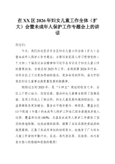 在XX区2026年妇女儿童工作全体(扩大)会暨未成年人保护工作专题会上的讲话同志们:今天,我们在这里召开全区妇女儿童工作全体(扩大)会暨未成年人保护工作专题会,主要任务是深入学习贯彻党的二十大和二十届历次全会精神和习近平总书记关于妇女儿童工作的重要论述,全面总结2025年工作,系统部署2026年任务,动员全区上下以更加昂扬的姿态、更加务实的作风,奋力开创我区妇女儿童事业高质量发展的新篇章。刚刚过去的2025年,是“十四五”规划的收官之年。全区上下同心协力,攻坚克难,推动妇女儿童事业取得了显著成就,各项工作迈上了新台阶。妇女儿童发展环境持续优化,权益保障体系更加健全,服务水平稳步提升。特别是,覆盖全区13个街道(乡镇)的未成年人保护工作站已经全面建成并投入运营,覆盖率达到100%,为基层未成年...
