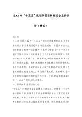 在XX市“十五五”规划纲要编制座谈会上的讲话(精品)同志们:今天,我们召开XX市“十五五”规划纲要编制座谈会,主要任务是深入学习贯彻习近平总书记在党的二十届四中全会上的重要讲话精神和全会精神,认真学习贯彻《中共中央关于制定国民经济和社会发展第十五个五年规划的建议》,紧密结合XX实际,集思广益、群策群力,共同绘制好我市“十五五”发展新蓝图。刚才,规划编制单位汇报了纲要编制情况,各位代表委员、专家学者和企业家作了很好的发言,提出了富有建设性的意见建议。我们将认真梳理、充分吸收,进一步提高规划编制的科学性和民主性。下面,我就高质量编制好“十五五”规划,谈几点意见。一、深学细悟,把握方向之舵“十五五”时期是我国全面建成小康社会、实现第一个百年奋斗目标之后,乘势而上开启全面建设社会主义现代化国家新征程...