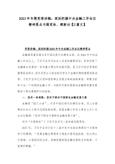 2023年专题党课讲稿:深刻把握中央金融工作会议精神要点与强党性、建新功【2篇文】党课讲稿:深刻把握2023年中央金融工作会议精神要点金融高质量发展关系中国式现代化建设全局。在2023年中央金融工作会议上,习近平总书记在会上发表的重要讲话,科学回答了金融事业发展的一系列重大理论和实践问题,是习近平经济思想的重要组成部分,是马克思主义政治经济学关于金融问题的重要创新成果,习近平总书记从党和国家事业发展全局的战略高度,部署当前和今后一个时期的金融工作,为新时代新征程推动金融高质量发展提供了根本遵循和行动指南。一、坚定一条道路:坚定不移走中国特色金融发展之路金融是“国之大者”,关系中国式现代化建设全...