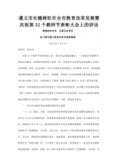 遵义市长魏树旺在全市教育改革发展暨庆祝第32个教师节表彰大会上的讲话增强教育自信压紧压实责任奋力谱写遵义教育改革发展新篇章(2016年9月6日)老师们,同志们:在第32个教师节即将到来之际,我们在这里隆重集会,一方面是庆祝教师节,表彰先进集体、优秀教师和教育工作者,另一方面是对全市教育改革发展工作进行安排部署。刚才,会议表彰了2016年度全市优秀教师、优秀教育工作者、先进班集体和尊师重教先进集体,吴元江、张建强、冉贤芬三位老师和遵义思达置业有限公司代表分别作了发言,为我们树立了榜样,值得大家认真学习。在此,我代表市委、市政府,向受表彰的先进单位和优秀个人表示热烈的祝贺!向辛勤工作在教育战线上的...