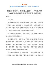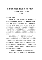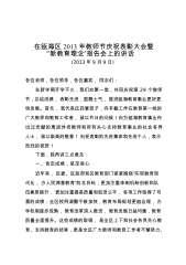 在瓯海区2013年教师节庆祝表彰大会暨“新教育理念”报告会上的讲话(2013年9月9日)各位老师,各位领导,各位嘉宾,同志们:在新学期开学不久,我们欢聚一堂,共同庆祝第29个教师节,总结成绩,表彰先进,鼓舞士气,推进瓯海教育事业更好更快发展。首先,我代表区四套班子,向辛勤工作在教育第一线的广大教师和教育工作者,致以节日的问候!向为瓯海教育事业作出过贡献的离退休老教师和所有关心支持教育事业的社会各界人士,致以崇高的敬意!向受表彰的先进集体和先进个人,表示热烈的祝贺!下面,我再讲三点意见:一、肯定成绩,坚定信心近年来,区委、区政府和区教育部门紧紧围绕“实现教育现代化,办人民满意教育”的总目标,更加...