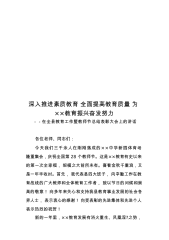 做出类拔萃“大先生”育德才兼备好大夫——在医学院庆祝第38个教师节大会上的讲话老师们、同志们、同学们:白露染秋稻米香,秋分过后谷子黄。在*疫情走向消退的特殊金秋,我们迎来了我国第38个教师节,也是党的十八大以来第10个教师节。今天,我们欢聚一堂,共同庆祝我们自己的节日,隆重表彰做出突出贡献的优秀教职员工,在此,我谨代表*二院党委、行政向受表彰的同志们表示热烈的祝贺!向全院教职员工致以节日的问候和崇高的敬意!滋兰树蕙,桃李芬芳。一年来,全院广大教职员工,坚守信念、恪尽职守,兢兢业业、默默耕耘,勇于探索,医学教育成绩斐然,教学体系日益完善,学生规模持续扩大, 特别是在课程建设、教学改革、成果孵育、...