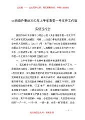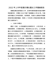 2022年上半年街道办事处重点工作督查报告根据区委区政府重点工作、区领导调研街道时的指示精神和街道实际,共确定2022年度**街道重点工作60项。为推动各项重点工作有效落实、有序推进,党政办公室每月开展推进落实情况跟踪督查,现就1-7月各项工作推进落实情况梳理汇总报告如下。一、总体工作情况截至7月底,10项街道民生实事项目中,1项已完成,4项推进顺利,5项推进滞后,滞后项目占比50%。12项街道重点工作专班推进项目中,6项推进顺利,6项推进滞后,滞后项目占比50%。14项市委、市政府重点工作涉及本区并需要街道参与的项目中,13项推进正常,1项推进滞后,滞后率占比7.14%。21项区委、区政府重...