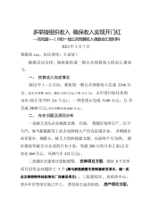 多举措组织收入确保收入实现开门红----东风路1—2月份一般公共预算收入调度会汇报材料2022年3月7日尊敬的xxx、各位领导:大家好!根据会议安排,现将我街道一般公共预算收入情况汇报如下:一、预算收入完成情况2022年1—2月份,我街道一般公共预算收入完成2346万元,较去年同期3425,减收1079万元(下降31.5%),占年度目标任务的14%(短正常序时2.6个点);一季度预计完成3100万元,力争完成3800万元(去年同期完成4080万元)。二、存在问题及原因分析一是缺乏龙头企业税源支撑。目前,我辖区郑州日产、红宇专汽、海马新能源等工业企业纳税大户均为县属企业,乡镇级企业存量少、规模小...