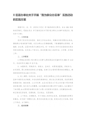 X街道办事处关于开展“我为群众办实事”实践活动的实施方案根据中央、省、市、县委关于党史学习教育的有关要求,结合XX街道的实际情况,现就在党史学习教育活动中开展“我为群众办实事”实践活动,制定如下方案:一、工作任务把学习党史同总结经验、推动工作结合起来,同解决实际问题结合起来,围绕群众“急难愁盼”问题,切实为群众办实事解难题,不断增强群众获得感、幸福感、安全感。全面加快现代化建设步伐,进一步转变工作作风发扬我党求真务实的光荣传统,在求真上下苦功夫,真正把精力投入到讲实话、办实事、求实效上来。二、工作要求1、明确完成时限。“我为群众办实事”主题实践活动实施时间为2021年1-12月,完成时间为20...