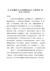 在道里区人社局“弘扬廉政文化创建廉洁机关”主题演讲报告会上的讲话同志们:今天是中国共产党成立92周年纪念日,区人社局在这里隆重举行“弘扬廉政文化,创建廉洁机关”主题演讲报告会,6位同志做了精彩演讲,从自己的所思、所想、所做,从不同的侧面,讴歌了为民、务实、清廉的廉政典型,彰显了新时期共产党员的精神风采。区人社局这个活动搞得很好,很及时,也很成功,这一活动对于推动全局乃至全区党风廉政建设的深入开展,对于弘扬正气、倡导社会新风、推动道里区和谐稳定发展具有十分重要意义。值此,我代表区政府对区人社局此次活动的成功举办表示热烈祝贺!向在座各位党员,并通过你们向区政府系统的广大党员同志们致以节日问候。借此...