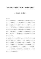 在XX区前三季度经济形势分析会暨区委财经委员会会议上的讲话(精品)同志们:今天我们召开全区前三季度经济形势分析会暨区委财经委员会会议,主要任务是深入学习贯彻总书记视察XX重要讲话、重要指示精神,全面落实党的二十届四中全会精神,以及省委、市委关于经济工作的最新部署要求,系统总结分析我区前三季度的经济运行情况,研判当前形势,找准问题短板,对第四季度的工作进行再动员、再部署,确保高质量完成全年各项目标任务,为“十四五”规划圆满收官和“十五五”良好开局奠定坚实基础。刚才,区统计局、发改局等几个主要经济部门作了很好的汇报,分析了数据,指出了问题,提出了建议。与会的各位同志也结合分管领域,谈了很好的意见。总的来看,大家的发言准备充分、分析透彻,体现了对全区发展大局的高度负责。下面,我结合同志们的意见和自...