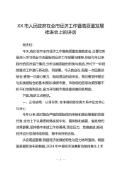 XX市人民政府在全市经济工作暨高质量发展推进会上的讲话同志们:今天,我们召开全市经济工作暨高质量发展推进会,主要任务是深入学习领会中央最新的经济工作部署与精神,总结今年以来我市的经济运行情况,分析当前面临的形势与挑战,并对下一阶段的重点工作进行再动员、再部署。今天的会议,既是一次回顾总结会,更是一次凝心聚力、推动落实的动员会。我们要坚持理论与实践相结合的基本原则,确保市委、市政府的各项决策部署不折不扣地落到实处,奋力开创我市高质量发展的新局面。下面,我讲三点意见。一、正视成绩、认清形势,在准确把握发展大局中坚定信心与决心今年以来,面对复杂严峻的国际国内形势和艰巨繁重的发展任务,全市上下认真贯彻落实党中央、国务院和省委、省政府的决策部署,坚持稳中求进工作总基调,顶住压力、克难奋进,推动经济运行...