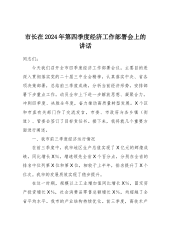 市长在2024年第四季度经济工作部署会上的讲话同志们:今天我们召开全市四季度经济工作部署会议,主要目的是深入贯彻落实党的二十届三中全会精神,认真落实中央、省各项决策部署,总结前三季度成绩,分析当前经济形势,安排部署下步重点工作,动员全市上下进一步解放思想、凝聚合力,冲刺四季度、决胜全年度,奋力推动高质量转型发展。X个区和市直有关部门作了交流发言,市委、市政府与各乡镇(街道)、管委会签订了目标责任书。接下来,我将就几个重要方面进行阐述。一、我市前三季度经济运行情况在前三季度中,我市地区生产总值实现了X亿元的辉煌成绩,同比增长X%,增速领先全省X个百分点,分别在全省的排名中位列第X位和第X位,相较...
