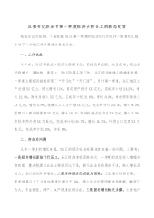 区委书记在2022年一季度“开门红”经济运行分析会上的主持讲话同志们:今天,我们召开2022年一季度“开门红”经济运行分析会,主要任务是专题分析调度我区一季度经济运行情况,找准问题症结,采取有效措施,促进增速回升、排名上升,确保完成“开门红”目标任务。今天的会议共有三项议程,下面依次进行。首先,进行第一项议程,请分管区领导汇报“开门红”目标完成情况,存在问题及下阶段工作打算。下面,请XX同志汇报一般公共预算收入推进情况。……………(汇报完毕)下面,请XX同志汇报工业、服务业、社消零指标推进情况。……………(汇报完毕)下面,请XX同志汇报城镇居民人均可支配收入推进情况。……………(汇报完毕)下面...
