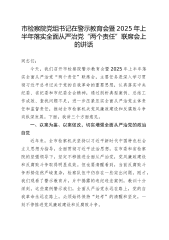 市检察院党组书记在警示教育会暨2025年上半年落实全面从严治党“两个责任”联席会上的讲话同志们:今天,我们召开市检察院警示教育会暨2025年上半年落实全面从严治党“两个责任”联席会,主要任务是深入学习贯彻习近平总书记关于党的自我革命的重要思想,认真落实中央纪委、省纪委和市纪委全会精神,通过剖析典型案例、总结工作成效、查找问题不足,进一步压紧压实全面从严治党主体责任和监督责任,推动全市检察机关党风廉政建设和反腐败斗争向纵深发展。下面,我讲三个方面意见。一、以案为鉴、以案促改,切实增强全面从严治党的政治自觉近年来,全市检察机关坚持以习近平新时代中国特色社会主义思想为指导,全面贯彻习近平法治思想,在市委和省检察院的坚强领导下,坚定不移推进全面从严治党,党风廉政建设和反腐败斗争取得明显成效。但也要清...