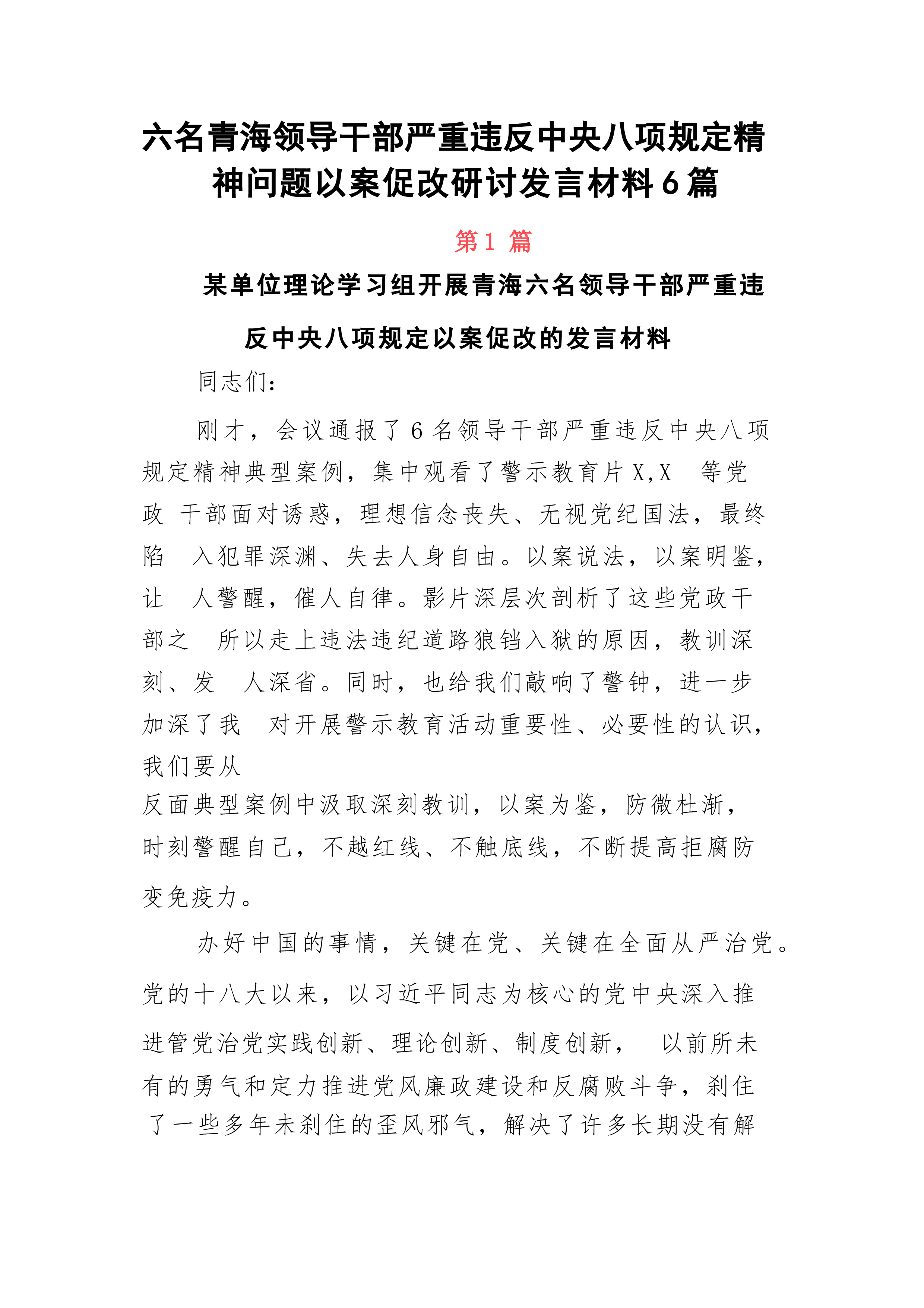 六名青海领导干部严重违反中央八项规定精神问题以案促改研讨发言材料6篇第1篇某单位理论学习组开展青海六名领导干部严重违反中央八项规定以案促改的发言材料同志们:刚才,会议通报了6名领导干部严重违反中央八项规定精神典型案例,集中观看了警示教育片X,X等党政干部面对诱惑,理想信念丧失、无视党纪国法,最终陷入犯罪深渊、失去人身自由。以案说法,以案明鉴,让人警醒,催人自律。影片深层次剖析了这些党政干部之所以走上违法违纪道路狼铛入狱的原因,教训深刻、发人深省。同时,也给我们敲响了警钟,进一步加深了我对开展警示教育活动重要性、必要性的认识,我们要从反面典型案例中汲取深刻教训,以案为鉴,防微杜渐,时刻警醒自己,...