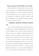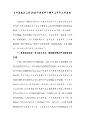 X市直机关工委2021年党史学习教育上半年工作总结自党史学习教育开展以来,市直机关委深入学习贯彻习近平总书记在党史学习教育动员大会上的重要讲话精神和视察贵市重要讲话精神,认真贯彻落实全省、全市党史动员大会精神,紧扣“学史明理、学史增信、学史崇德、学史力行”目标,突出学党史、悟思想、办实事、开新局要求,深入开展专题学习、宣传宣讲、专题调研、办实事解难题、警示教育等,党史学习教育取得了阶段性成效,现将2021年上半年党史学习教育工作总结如下。一、提高政治站位,强化组织领导,高位推动党史学习教育有序开展年初,将开展党史学习教育纳入2021年市直机关党的建设工作要点重要内容印发xx家市直机关直属基层党...