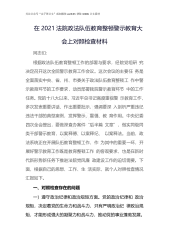 2021年区司法局队伍政法教育整顿查纠整改环节专题组织生活会个人对照检查发言按照《关于组织开展全系统队伍教育整顿查纠整改环节专题组织生活会》通知要求和部署,我认真学习了习近平法治思想、习近平关于新时代政法工作的重要论述,参加了政治轮训、警示教育、英模教育等,学习了典型案例、观看了廉政教育片,思想上收到深刻的教育,政治觉悟有了很大的提高。在此基础上,紧紧围绕6个方面,认真查摆自身存在问题,剖析原因,找准短板,明确了今后的工作方向和目标措施,现对照检查如下:一、存在的主要问题(一)对这次教育整顿的认识,对教育整顿表明态度方面。开展教育整顿活动是一项紧迫而又艰巨的政治任务,包括学习教育、查纠问题、整...