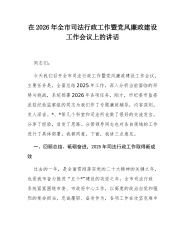在2026年全市司法行政工作暨党风廉政建设工作会议上的讲话同志们:今天我们召开全市司法行政工作暨党风廉政建设工作会议,主要任务是,全面总结2025年工作,深入分析当前面临的形势与挑战,系统部署2026年各项任务。刚才,市纪委市监委派驻纪检监察组的同志为我们作了专题廉政辅导,内容深刻,发人深省。*、*等几个科室和司法所也做了很好的交流发言,分享了经验,启发了思路。分管领导同志也对各自领域的工作进行了具体部署,我都同意。下面,我讲三点意见。一、回顾总结、砥砺奋进,2025年司法行政工作取得新成效过去的一年,是全面贯彻落实党的二十大精神的关键之年,也是我市奋力推进“五个*”建设的攻坚之年。全市司法行政系统紧紧围绕市委、市政府中心工作,以高度的政治自觉和强烈的使命担当,忠诚履职、奋发作为,各项工作在...