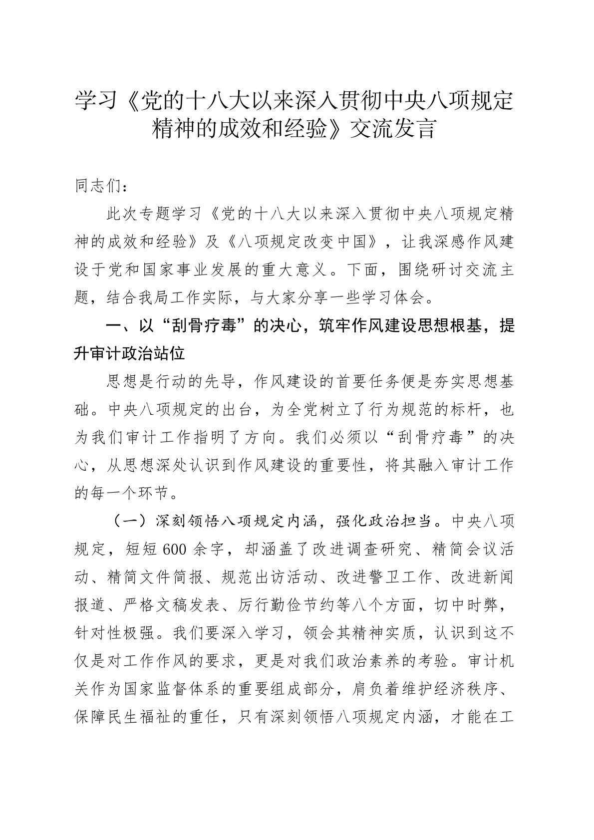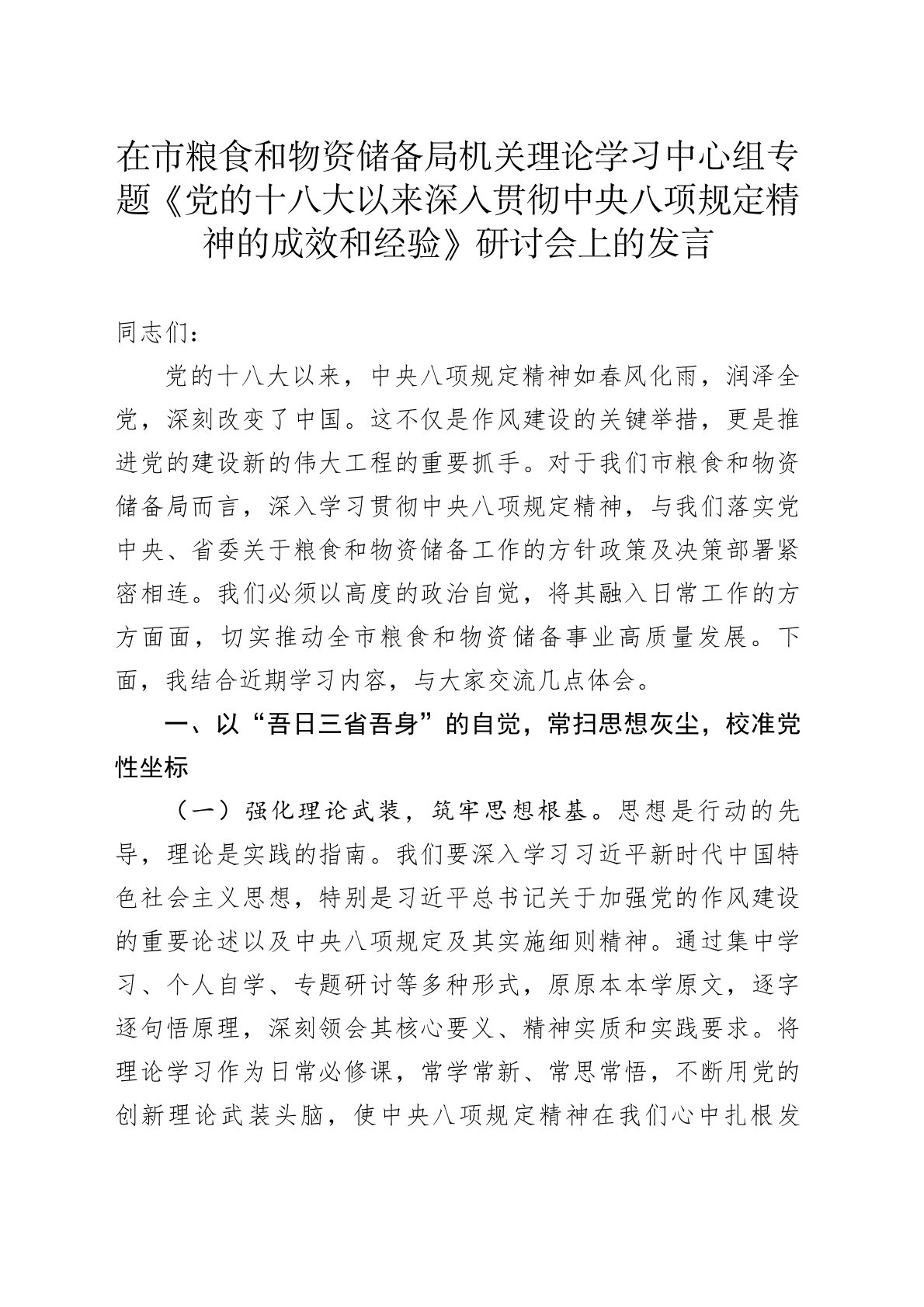 在市粮食和物资储备局机关理论学习中心组专题《党的十八大以来深入贯彻中央八项规定精神的成效和经验》研讨会上的发言