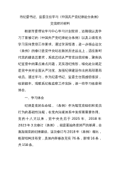 市纪委书记、监委主任学习《中国共产党纪律处分条例》交流研讨材料根据市委理论学习中心学习计划安排,近期我认真学习了新修订的《中国共产党纪律处分条例》以及上级有关学习宣传贯彻工作要求。通过学深悟透,进一步领会这次《条例》的修订是党中央站在新的历史起点上,适应新时代党的建设总要求,系统总结从严管党治党经验,聚焦执纪监督中的重点难点问题,充实违纪情形,细化处分规定是党中央对全面从严治党、加强纪律建设作出的再部署再动员。通过学习,作为纪委书记、监委主任我感悟很深,收获颇丰。现联系纪检监察工作实际,谈一些学习收获和体会。一、学习体会纪律是党的生命线,《条例》作为规范党组织和党员行为的基础性法规,在党内法规...