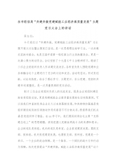 在市经信局“共建共振党建赋能工业经济高质量发展”主题党日大会上的讲话同志们:今天我们以“共建共振,党建赋能工业经济高质量发展”为主题开展大讨论暨主题党日活动,是一次思想理论的学习会,一次共建交流的对接会,也是五届市委第一轮巡察立行立改的整改会,更是一次凝心聚力的动员会。会议安排了十九届X中X会精神学习,邀请了三位企业党组织负责人作共建交流发言,各科室负责人围绕党建和业务相融合这个主题进行了充分的讨论和发言,活动有层次,形式有创新,讨论有热度,结合了理论学习、主题党日、非公党建、党组织共建和巡察整改,是一次质量很高的党日活动。刚才三位企业党组织负责人的交流发言,既是企业党组织建设的宝贵经验总结,...