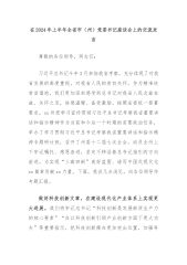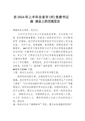 在2024年上半年全省市(州)党委书记座谈会上的交流发言尊敬的各位领导,同志们:习近平总书记今年3月亲临我省考察,充分体现了对我省发展的高度重视,对我省人民的亲切关怀。作为精准扶贫首倡地,我们更加深刻感受到总书记对我省人民念兹在兹、关怀之至,倍感温暖、备受激励。按照省委统一部署要求,**州把学习宣传贯彻习近平总书记考察我省重要讲话和指示精神作为当前和今后一个时期的首要政治任务,举办了学习贯彻习近平总书记考察我省重要讲话和指示精神专题研讨班,召开了州委十二届七次全会,动员全州上下牢记嘱托、感恩奋进,坚定不移沿着总书记指引的方向前进,为实现“三高四新”美好蓝图、谱写中国式现代化**篇章贡献**力量...