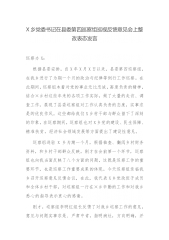 X乡党委书记在县委第四巡察组巡视反馈意见会上整改表态发言巡察办X:根据县委安排,自X年X月X日以来,县委第四巡察组,在我乡进行了为期一个月的政治与纪律等例行工作巡察。在此期间,巡察组本着对党的事业无比忠诚,高度负责的精神,结合×乡村这些年来的各项工作实际,做了大量的走访、调查工作,展现了县委巡察组对工作认真负责的态度,实事求是的优良作风。这些都给我们X乡村干部与群众留下了深刻的印象,在巡察期间,巡察组也对X乡党的建设、民生保障、精准扶贫,经济社会领域发展等方面提出了建设性意见。巡察组进驻X乡为期一个月,根据抽查、翻阅乡村财务资料,和乡村干部群众反映,刚才在会前第一个环节,巡察组也向我当面反映了...