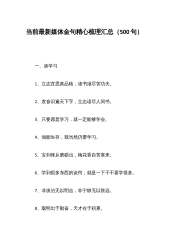 当前最新媒体金句精心梳理汇总(500句) 一、谈学习 1、立志宜思真品格,读书须尽苦功夫。 2、发奋识遍天下字,立志读尽人间书。 3、只要愿意学习,就一定能够学会。 4、倘能生存,我当然仍要学习。 5、宝剑锋从磨砺出,梅花香自苦寒来。 6、学到很多东西的诀窍,就是一下子不要学很多。 7、非淡泊无以明志,非宁静无以致远。 8、聪明出于勤奋,天才在于积累。 9、路漫漫其修道远,吾将上下而求索。 10、此刻打盹,你将做梦。此刻学习,你将圆梦。 11、人生代代无穷已,学识绵绵无绝期。 12、书山有路勤为径,学海无涯苦作舟。 13、生活就像海洋,只有意志坚强的人,才能到达彼岸...