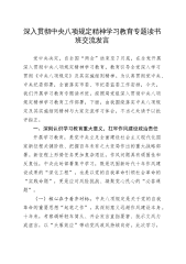深入贯彻中央八项规定精神学习教育专题读书班交流发言党中央决定,自全国“两会”结束至7月底,在全党开展深入贯彻中央八项规定精神学习教育,教育引导全党深入学习贯彻《中央八项规定》及其实施细则精神。为认真贯彻党中央、中央纪委部署,全面落实市委、市纪委监委工作安排,今天,我们开展学习教育专题读书班。按照局党组深入贯彻中央八项规定精神学习教育工作部署,下面,由我围绕落实中央八项规定及其实施细则精神与大家交流学习体会,不当之处请予以批评指正。一、深刻认识学习教育重大意义,扛牢作风建设政治责任开展学习教育,是党中央立足全面建设社会主义现代化国家新征程关键阶段、把握百年未有之大变局作出的重大战略部署。新征程上...