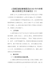 ·1x区新区建设管理委员会2021年今冬明春火灾防控工作方案范文(1)按照《x市x区消防安全委员会关于印发全区今冬明春火灾防控工作方案的通知》(x荣办发2021x号)文件精神。为切实加强我委今冬明春消防安全工作,坚决预防和遏制有影响的火灾事故发生,决定从2021年12月起至2022年3月期间,在x新区内集中组织开展今冬明春火灾防控工作。特制定工作方案如下:一、工作目标认真贯彻落实习近平总书记关于消防安全的系列重要指示精神,坚持人民至上、生命至上理念,统筹好发展和安全,围绕北京冬奥会和冬残奥会、“两会”等重大活动和元旦、春节、元宵节等重要节点,聚焦项目建设重点区域和薄弱环节,集中开展冬春火灾防控...