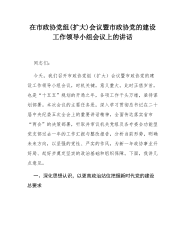 在市政协党组(扩大)会议暨市政协党的建设工作领导小组会议上的讲话同志们:今天,我们召开市政协党组(扩大)会议暨市政协党的建设工作领导小组会议,时机关键,意义重大。此时正值岁首,也是“十五五”规划的开局之年,各项工作千头万绪,亟待谋划部署。本次会议的主要任务是,深入学习贯彻总书记在二十届中央纪委五次全会上的重要讲话精神,全面传达落实省市“两会”的决策部署,听取并审议机关党组及各专委会功能型党支部过去一年的工作汇报与整改报告,分析当前形势,明确未来方向,以坚强的党性、严实的作风,为新一年政协事业开好局、起好步奠定坚实的政治基础和组织保障。下面,我讲几点意见。一、深化思想认识,以更高政治站位把握新时代党的建设总要求党的领导是人民政协事业发展的根本保证。抓好政协工作,必须首先抓好党的建设。只有深刻领...