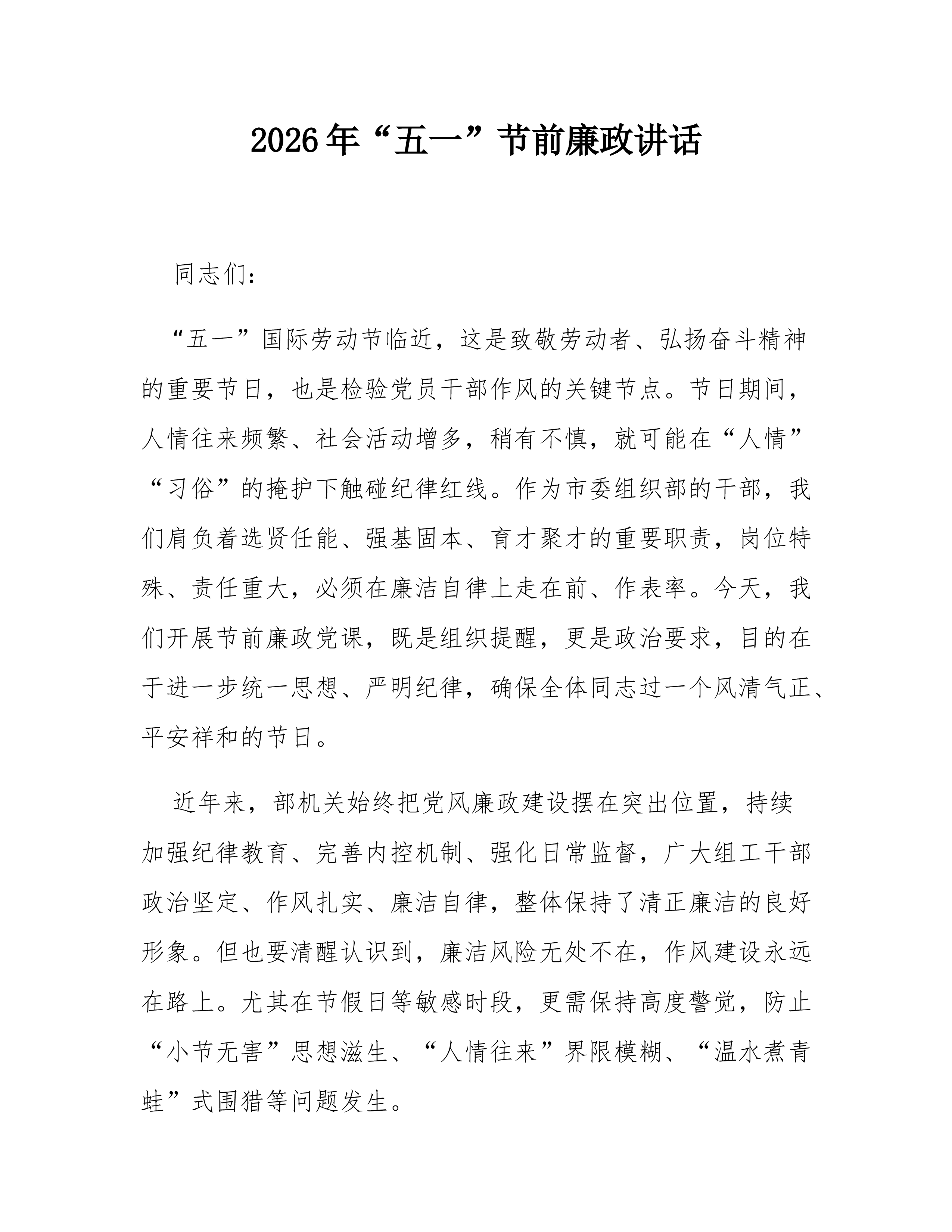 在2026年“五一”劳动节节前廉政提醒谈话会上的讲话同志们:节假日是检验干部政治定力的重要关口,是“四风”问题隐形变异的高发时段,更是全面从严治党向纵深推进的关键节点。为进一步严明节日期间纪律要求,营造安全、文明、廉洁的节日氛围,今天组织召开节前廉政提醒谈话会,旨在早提醒、早预防、早纠偏,切实把纪律和规矩挺在前面,拉紧节日廉洁这条“高压线”。刚才,通报了几起反面典型案例,观看了警示教育纪录片《反腐为了人民》,通过以案示警、以案为戒,提醒全体干部职工时刻绷紧纪律之弦,坚决守住廉洁底线。“五一”劳动节即将来临,今天我们开门见山、实事求是,目的就是拉紧纪律这条线,构建廉洁的屏障,确保全局上下能过一个安心、清白、祥和的节日。下面,我再强调节点意见:一、严守纪律底线,切实筑牢廉洁自律“防火墙”刚才警示...