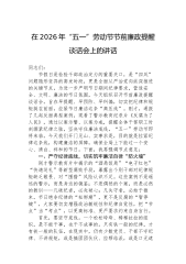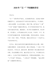 在2026年“五一”劳动节节前廉政提醒谈话会上的讲话同志们:节假日是检验干部政治定力的重要关口,是“四风”问题隐形变异的高发时段,更是全面从严治党向纵深推进的关键节点。为进一步严明节日期间纪律要求,营造安全、文明、廉洁的节日氛围,今天组织召开节前廉政提醒谈话会,旨在早提醒、早预防、早纠偏,切实把纪律和规矩挺在前面,拉紧节日廉洁这条“高压线”。刚才,通报了几起反面典型案例,观看了警示教育纪录片《反腐为了人民》,通过以案示警、以案为戒,提醒全体干部职工时刻绷紧纪律之弦,坚决守住廉洁底线。“五一”劳动节即将来临,今天我们开门见山、实事求是,目的就是拉紧纪律这条线,构建廉洁的屏障,确保全局上下能过一个安心、清白、祥和的节日。下面,我再强调节点意见:一、严守纪律底线,切实筑牢廉洁自律“防火墙”刚才警示...