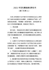 2021年党风廉政建设责任书(部门负责人)为深入贯彻落实习近平新时代中国特色社会主义思想和十九届中央纪委四次全会精神,全面推进从严治党、从严治院向纵深发展,不断增强“一岗双责”落实,切实促进审判执行工作实现高质量发展,特制定如下责任书。一、责任范围班子成员、党组成员对所分管部门的党风廉政建设负责,对分管部门负责人党风廉政建设负直接领导责任。部门负责人对本部门党风廉政建设负责,对本恩自身廉洁自律负全部责任。二、责任内容1、认真学习习近平新时代中国特色社会主义思想,始终在思想上政治上行动上始终同以习近平同志为核心的党中央保持高度一致,不断增强“四个意识”,坚定“四个自信”、做到“两个维护”,自觉遵...