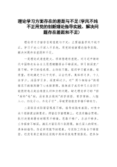 理论学习方面存在的差距与不足(学风不纯不正用党的创新理论指导实践、解决问题存在差距和不足)理论学习方面存在的差距与不足:主要涵盖学风不纯不正,学习不走心不深入不系统,用党的创新理论指导实践、解决问题存在差距和不足。一是理论武装差距大,学深悟透有差距。对习近平新时代中国特色社会主义思想精髓领会不够深刻,学习的深度广度不够,学习的危机感、主动性不强,组织学习重次数,轻质量,有时满足于以干代学、以会代学,集体学习多、个人自学少,浅层学习多、深度研讨少,对”两个相结合"的领悟还不能做到静下心来悟原理,致使班子成员学习之后仍不能很好地从政治角度认识和分析问题,缺乏理论学习的“挤"劲和"钻"劲,没有真正做...