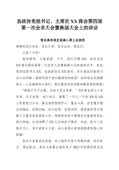 县政协党组书记、主席在XX商会第四届第一次会员大会暨换届大会上的讲话情系桑梓谋发展凝心聚力启新程尊敬的各位来宾、各位乡亲,各位会员、朋友们:大家下午好!春和景明,万象更新。今天,我们齐聚XX,共同见证XX商会第四届第一次会员大会暨换届大会的胜利召开。首先,我受县委书记XX、县政府县长XX委托,并代表县四套班子,向大会和新一届领导班子表示最热烈的祝贺!向所有在京拼搏奋斗、心系桑梓的乡亲们,致以最亲切的问候和最美好的祝愿!“树高千尺不忘根,水流万里总思源。”XX商会成立十余年来,从无到有、由小到大,凝聚了一代又一代在XX的XX人的智慧与汗水。商会始终围绕中心、服务大局,在党建引领、会员服务、资源对接、返乡投资、扶贫济困、捐资助学等方面做了大量卓有成效的工作,特别是在家乡需要时总能挺身而出、倾力相...