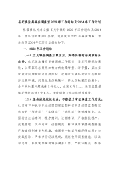 某县纪委监委审查调查室2023年工作总结及2024年工作计划根据委机关办公室《关于做好2023年工作总结及2024年工作谋划的通知》要求,现将我室2023年审查调查工作总结及2024年工作计划报告如下。一、2023年工作总结(一)立足审查调查主责主业,始终保持惩治腐败高压态势。依纪依法履行审查调查工作职责,坚定不移惩治腐败以零容忍态度更加有力有效遏增量、清存量,坚决查处政治问题和经济问题交织、政商勾连破坏政治生态和经济发展环境、问题线索反映集中、群众反映强烈的案件。全年共处置问题线索XX件XX人,立案XX件XX人,采取留置措施并移送起诉XX件XX人,审查调查工作取得明显成效。(二)坚持依规依纪...