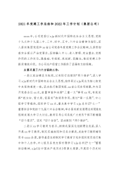 2021年党建工作总结和2022年工作计划(集团公司)xxxx年,公司党委以xjp新时代中国特色社会主义思想、党的十九大和十九届二中、三中、四中、五中、六中全会精神为指引,深入落实集团党组和xx省公司党委年度党建工作会议精神,认真贯彻落实全面从严治党要求,坚持融入中心、进入管理、突出重点、发挥作用的工作定位,强基础、补短板、抓创新、促融合,推动党建工作提质增效升级,为公司生产经营工作提供了坚强有力的保障。主要开展了六个方面的工作:一是以政治建设为统领,以实际行动做到“两个维护”。深入学习xjp新时代中国特色社会主义思想,始终同以xjp同志为核心的党中央保持高度一致,坚决执行集团党组、xx省公司...