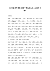 在XX县政府党组2025年度民主生活会上的讲话(精品)同志们:按照党中央部署和省委、市委、县委安排,今天我们召开县政府党组2025年度民主生活会。刚才,大家紧扣会议主题,对照五个方面重点内容以及相关典型案例,认真开展批评和自我批评,查摆问题不遮不掩,剖析原因深刻透彻,整改措施务实可行,达到了交流思想、检视问题、明确方向的目的。县纪委监委、县委组织部有关同志作了点评指导,既肯定了会议成效,也提出了明确要求,我们要认真抓好贯彻落实。下面,结合本次民主生活会情况和当前工作实际,我讲几点意见。一、始终对党忠诚,做政治坚定的表率政治坚定是党员干部的首要品质,对党忠诚是根本政治要求。县政府党组成员作为"关键少数",必须在政治上过得硬、靠得住,始终做政治上的明白人。要深刻领悟"两个确立"的决定性意义,增强...