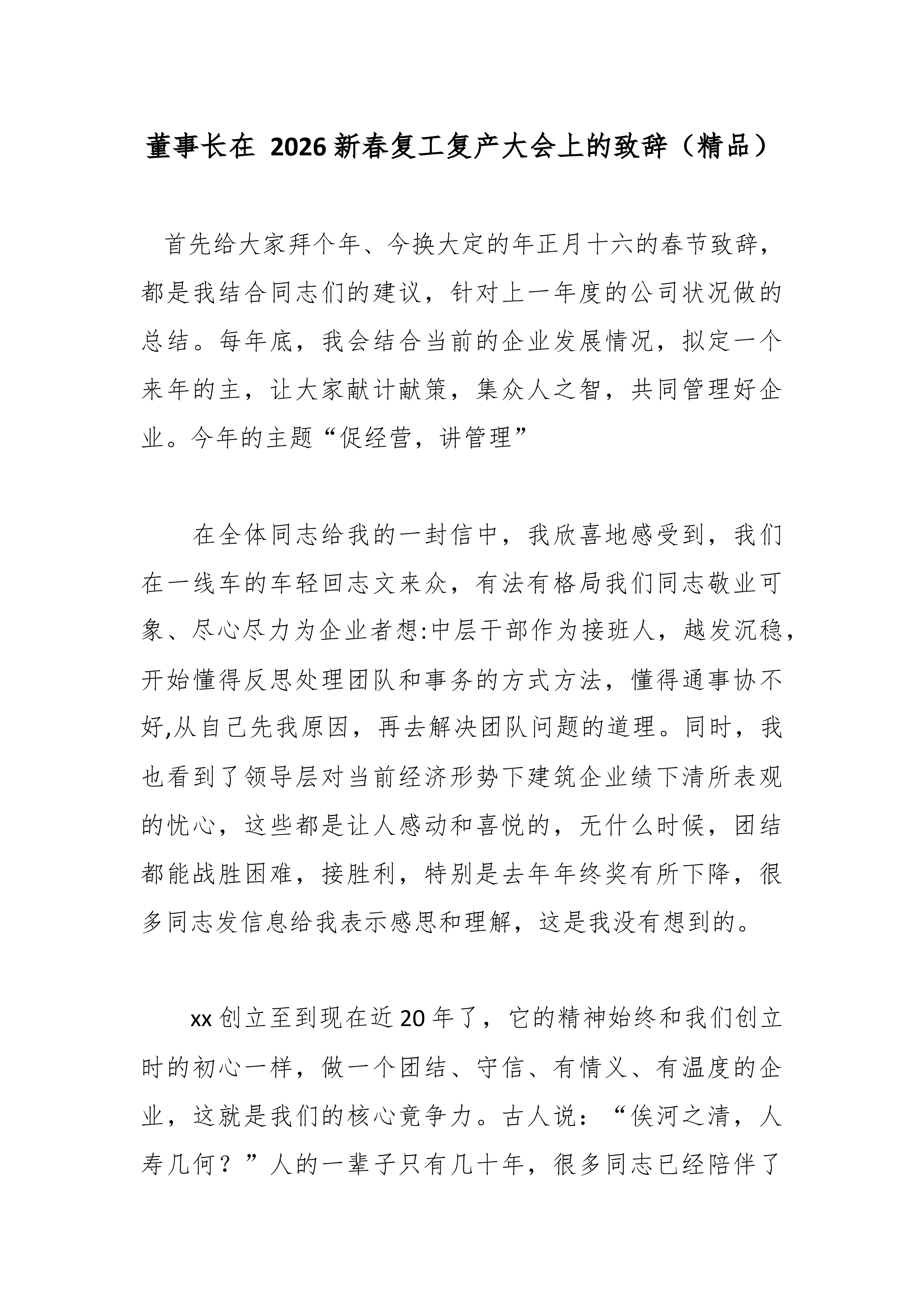 董事长在2026新春复工复产大会上的致辞(精品)首先给大家拜个年、今换大定的年正月十六的春节致辞,都是我结合同志们的建议,针对上一年度的公司状况做的总结。每年底,我会结合当前的企业发展情况,拟定一个来年的主,让大家献计献策,集众人之智,共同管理好企业。今年的主题“促经营,讲管理” 在全体同志给我的一封信中,我欣喜地感受到,我们在一线车的车轻回志文来众,有法有格局我们同志敬业可象、尽心尽力为企业者想:中层干部作为接班人,越发沉稳,开始懂得反思处理团队和事务的方式方法,懂得通事协不好,从自己先我原因,再去解决团队问题的道理。同时,我也看到了领导层对当前经济形势下建筑企业绩下清所表观的忧心,这些都是让人感动和喜悦的,无什么时候,团结都能战胜困难,接胜利,特别是去年年终奖有所下降,很多同志发信...