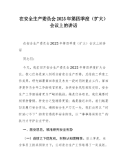 在安全生产委员会2025年第四季度(扩大)会议上的讲话在安全生产委员会2025年第四季度(扩大)会议上的讲话同志们:今天,我们召开安全生产委员会2025年第四季度扩大会议,核心任务是深入剖析当前安全生产形势,总结前三季度工作成果,研究部署第四季度及未来一段时间的重点工作。第四季度作为全年工作的收官阶段,各类安全风险相互交织,安全生产工作面临着更为严峻的挑战。越是任务艰巨,我们越要时刻保持警惕,将安全之弦绷得更紧;越是接近年终,我们越要切实履行安全责任,确保安全生产万无一失。我们必须以“时时放心不下”的责任感筑牢安全防线,以“事事落实到位”的执行力守护企业平安。一、居安思危,精准研判安全形势(一)成绩之下隐危机,形势认知需精准。前三季度,在全体员工的共同努力下,公司安全生产工作取得了一定成效。...