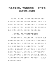 扎根希望田野,书写振兴华章——驻村干部2024年终工作总结时光荏苒,岁月如梭,这一年的驻村旅程即将迎来收尾。回望这一年,我肩负组织的信任与村民的期待,在乡村广袤的大地上,用汗水书写担当,用青春践行初心,用行动诠释使命。如今,站在岁末的节点上,总结这段岁月,是对过往的反思与激励,更是为未来蓄力,让乡村振兴的画卷愈发绚丽。一、深入调研,构筑乡村发展的“基础框架”“知屋漏者在宇下,知政失者在草野。”驻村伊始,摸清村情民意成为我的首要任务。我与村“两委”干部组成调研队伍,穿梭于田间地头,与村民面对面交流,倾听他们的心声和诉求。通过全面细致的走访,我掌握了村里的“人口底数”、经济现状、基础设施条件及产业...
