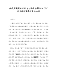 在XX县人民医院2025年年终总结暨2026年工作安排部署会议上的总结讲话(精品)同志们、朋友们:大家好!今天,我们齐聚一堂,隆重召开2025年年终总结暨2026年工作安排部署会议。这既是一次回顾过去、表彰先进的庆功会,更是一次展望未来、再启新程的动员会。刚才,胡XX院长全面系统地总结了医院2025年的工作,客观分析了我们面临的形势与挑战,并对2026年的重点任务作出了详尽的规划和部署,思路清晰,目标明确,措施有力,我完全赞同。张XX副院长所作的年度财务预决算报告,数据翔实,分析透彻,为我们科学决策、精益管理提供了坚实依据。同时,会议还通报了年度荣誉、论文发表及新技术新项目开展情况,这些成绩的背后,凝结着每一位XX医人的智慧、心血与汗水。特别是县卫生健康局王XX局长的亲临指导和重要讲话,既充...
