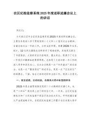 在XX区纪检监察系统2025年度述职述廉会议上的讲话(精品)同志们:今天我们召开全区纪检监察系统2025年度述职述廉会议,主要任务是深入学习贯彻党的二十大和二十届历次全会精神,全面总结过去一年的工作,分析当前形势,部署2026年任务。刚才,12位同志围绕各自职责作了现场述职,其他同志提交了书面报告。大家的发言内容翔实、重点突出,既展示了过去一年我们辛勤耕耘的累累硕果,也体现了大家对新一年工作的深入思考和坚定决心。这次会议既是一次“年终盘点”的总结会,也是一次“整装再发”的动员会,更是一次“压实责任”的部署会。下面,结合大家的述职和当前工作,我讲三点意见。一、肯定成绩,总结经验,在服务大局中彰显新担当2025年是全面贯彻落实党的二十大精神的关键之年,也是“十四五”规划承上启下的攻坚之年。一年来...