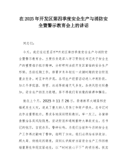 在XX开发区第四季度安全生产与消防安全暨警示教育会上的讲话(精品)同志们:今天,我们在这里召开XX开发区第四季度安全生产与消防安全暨警示教育会,主要任务是深入学习贯彻习近平总书记关于安全生产的重要指示批示精神,分析研判当前开发区面临的安全生产形势,总结近期工作,部署岁末年初这一关键时期的安全防范重点任务。时至年终岁尾,各项生产经营活动进入冲刺阶段,加之冬季低温、雨雪、冰冻等极端天气多发,各类风险交织叠加,安全生产的压力陡增,容不得我们有丝毫的麻痹和懈怠。就在上个月,2025年11月26日,香港新界大埔屋邨宏福苑发生火灾,造成了重大的人员伤亡和财产损失。习近平总书记对此作出重要批示,要求各地深刻吸取教训,举一反三,全面排查整治各类风险隐患,坚决防范和遏制重特大事故发生。总书记的批示,言犹在耳,...