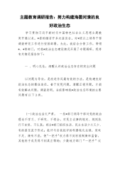 主题教育调研报告:努力构建海晏河清的良好政治生态学习贯彻习近平新时代中国特色社会主义思想主题教育开展以来,*委相继召开多次座谈会,对*级以上领导干部调查研究工作进行安排部署。为此,我结合分管工作,带领*、*等部门,对我*政治生态建设情况开展了专题调研。现将有关情况报告如下:一、明心见性,清醒认识政治生态存在的突出问题以问题为导向,是改进作风最有效的方法,是构建良好政治生态的最佳途径。善于发现问题,清醒正视问题,才能有效解决问题。调查表明,当前影响我*政治生态环境的主要问题有以下3类。(一)政治生活欠严肃。一些*部门领导干部对党的政治理论不学习、不研究、不领会,对民主议事的规定、规则执行不自觉、...