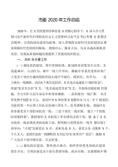 市委2020年工作总结2020年,在X的坚强领导和省委X的精心指导下,X深入学习贯彻习近平新时代中国特色社会主义思想和习近平总书记考察X重要讲话精神,以党的政治建设为统领,深入贯彻落实新时代党的建设总要求和新时代党的组织路线,围绕中心、服务大局,为X决战决胜脱贫攻坚、实现高质量跨越发展提供了坚强的组织保证。一、2020年主要工作(一)强化党的建设,筑牢疫情防线。新冠肺炎疫情发生以来,X迅速响应、主动作为,树牢一线工作导向,激励引导基层党组织和广大党员干部在打赢疫情防控阻击战中不缺位、做到位、有作为。一是力量向一线倾斜。动员X个基层党组织、X名党员迅速进入“战时状态”,组建“党员突击队”X支、“...