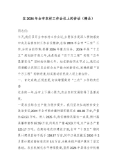 在XX镇2026年农村工作暨重点工作推进会议上的讲话(精品)同志们:一年之计在于春,开局起势见精神。今天,我们召开全镇2026年农村工作暨重点工作推进会议,主要任务是深入学习贯彻习近平总书记关于"三农"工作的重要论述和重要指示精神,全面落实2026年中央一号文件精神,以及中央和省市县委经济工作会议、农村工作会议精神,传达学习省市县安全生产和森林草原防灭火工作会议精神、全省主动创稳会议精神,全面总结2025年工作成效,深入分析当前发展形势,安排部署2026年农业农村、基层党建、安全生产、信访维稳、国土绿化、贷款清收等重点工作,动员全镇上下凝心聚力、真抓实干,奋力开创经济社会高质量发展新局面。刚才,会议传达学习了相关会议和文件精神。下面,我讲三点意见。一、充分肯定成绩,坚定发展信心2025年,全...